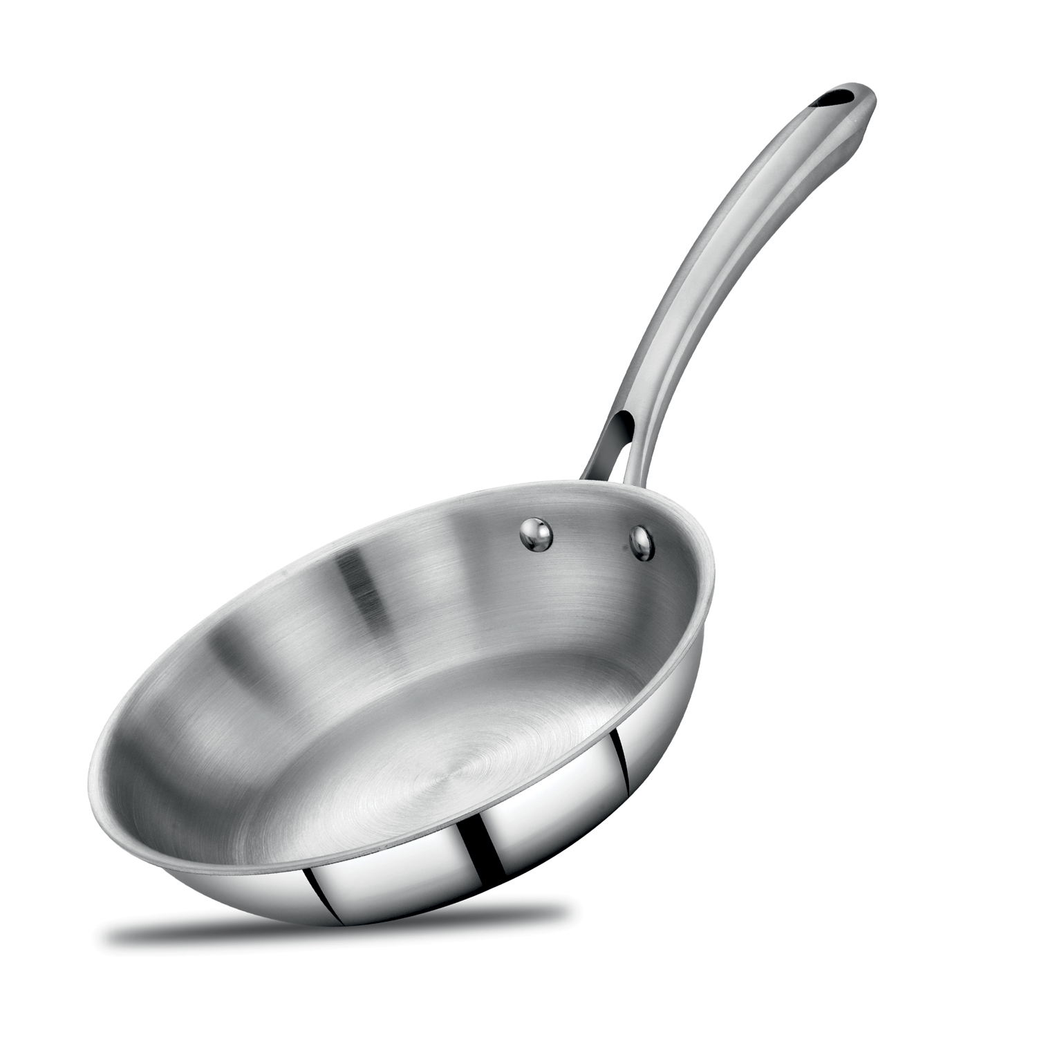 The inner layer is constructed of 304 grade stainless steel, which is rust-free and food safe. The middle layer is entirely made of aluminum, ensuring uniform heat distribution, and the third layer is constructed of 430 stainless steel which makes it compatible to be used on various heat sources like gas, induction, electrical, and halogen. This triply stainless steel kadai has an ergonomically designed riveted stainless steel handle which is made up of stainless steel casting, using cool touch technology which avoids it getting hot. This triply frypan uses less oil for cooking and saves fuel as it cooks your food 2X faster.