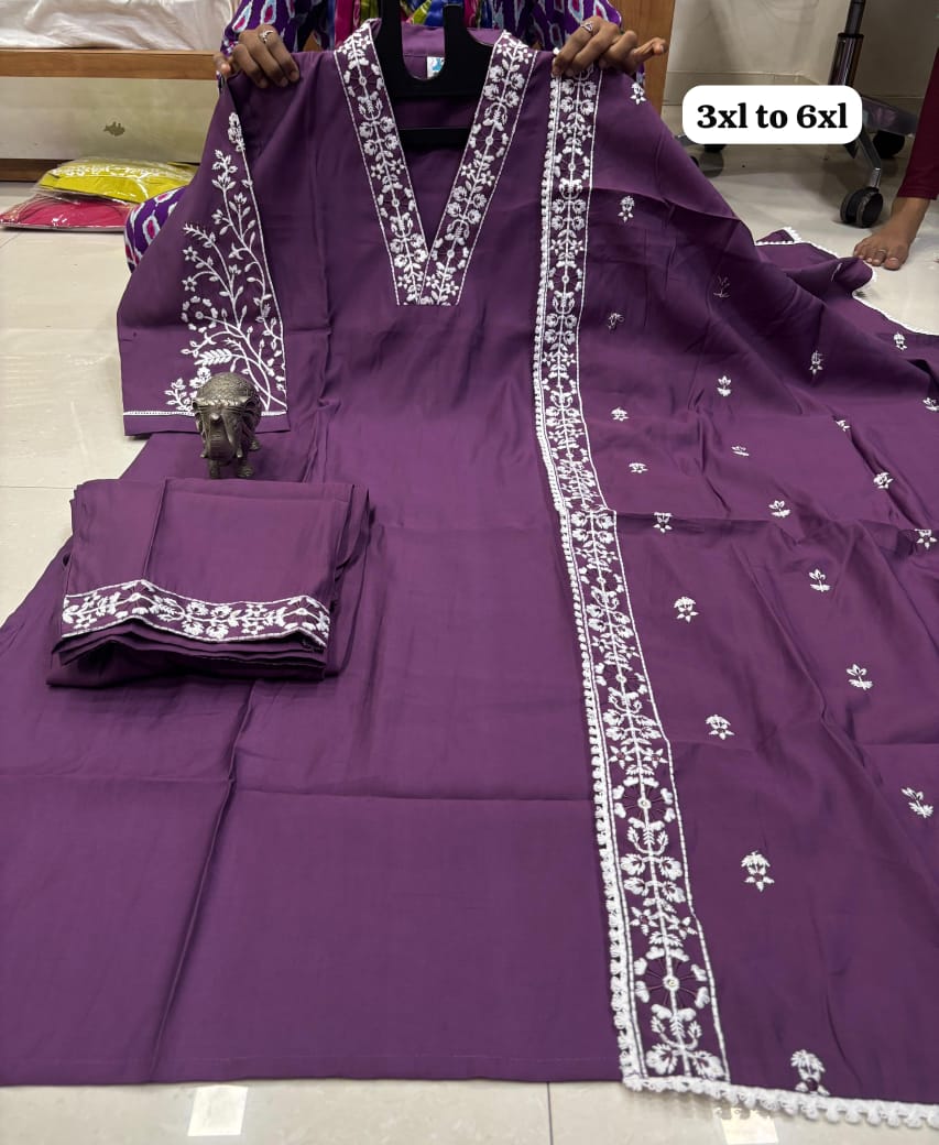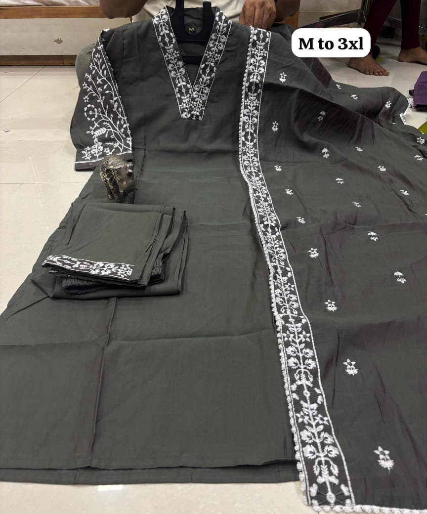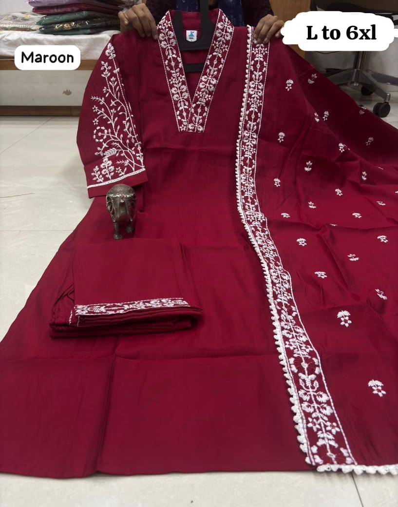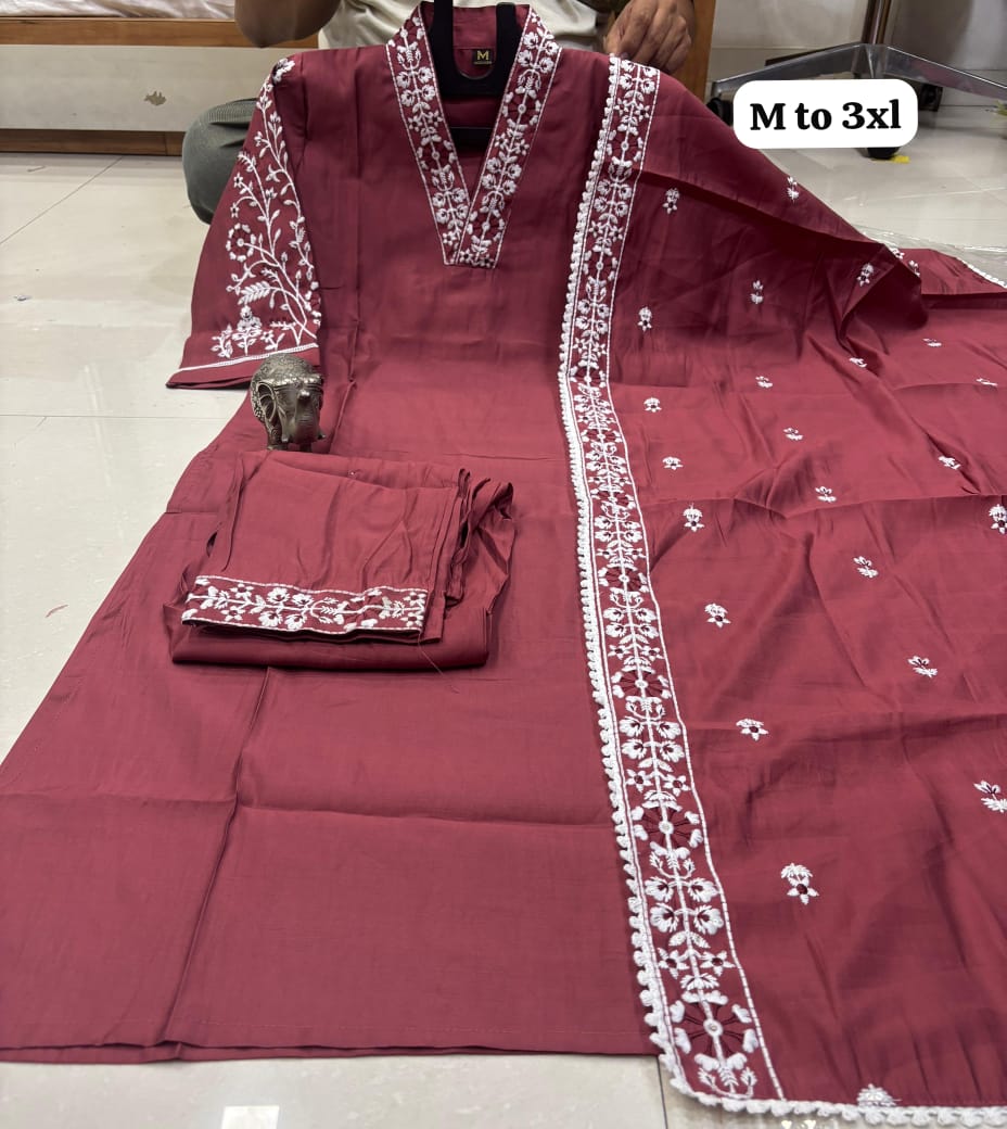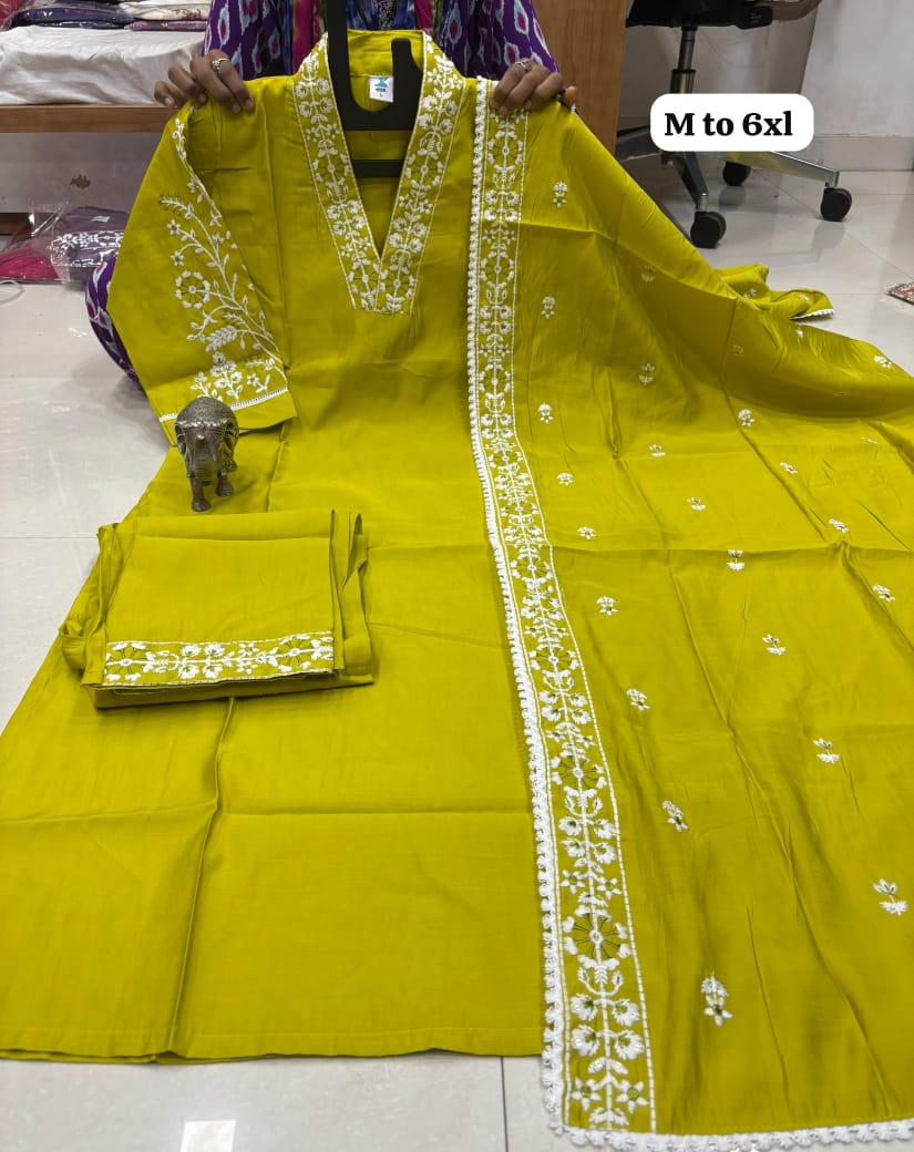*HEAVY MASLIN LAKHNAVI WORK V NECK KURTI WITH LAKHNAVI WORK DUPATTA PANT SET*😍.