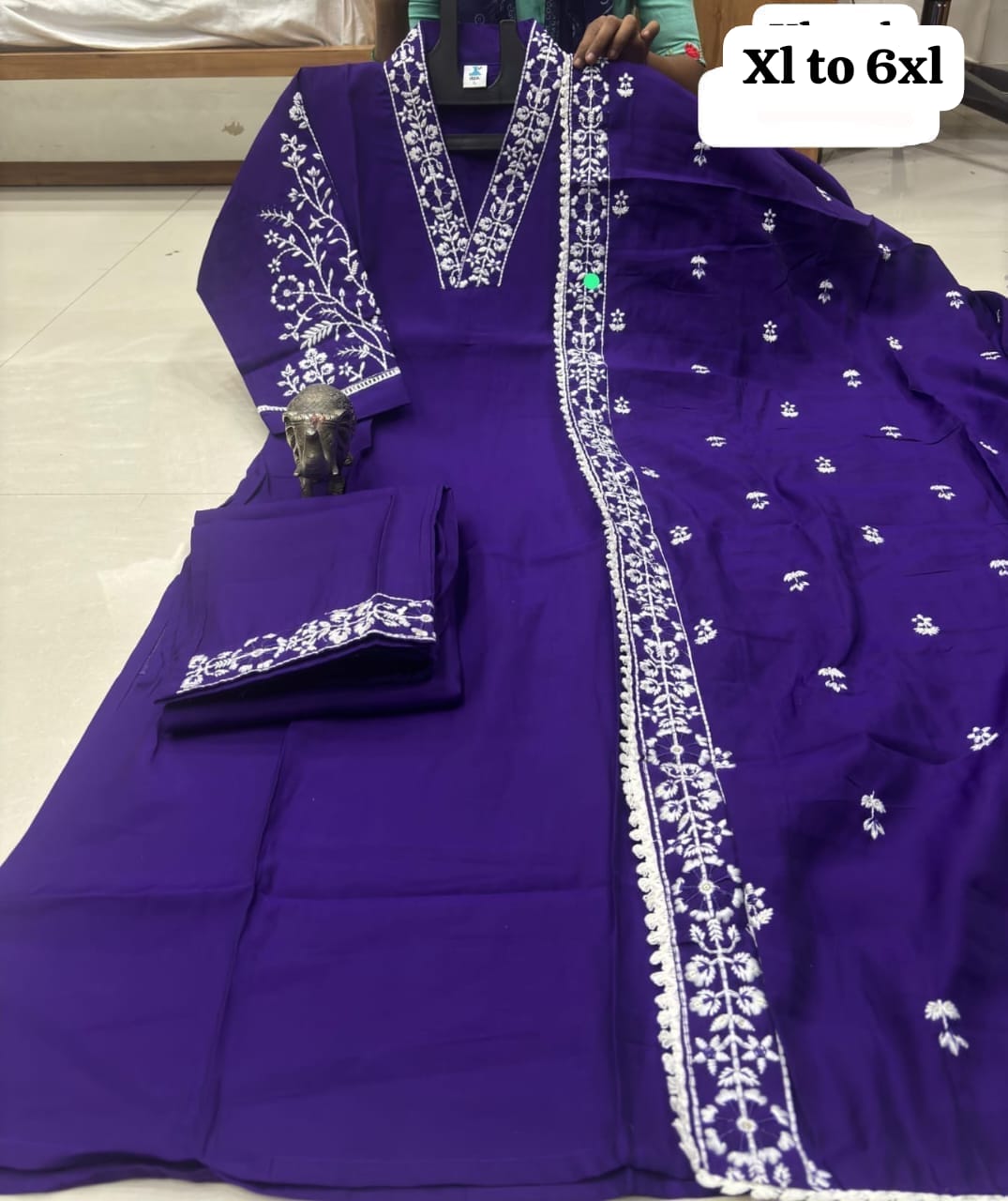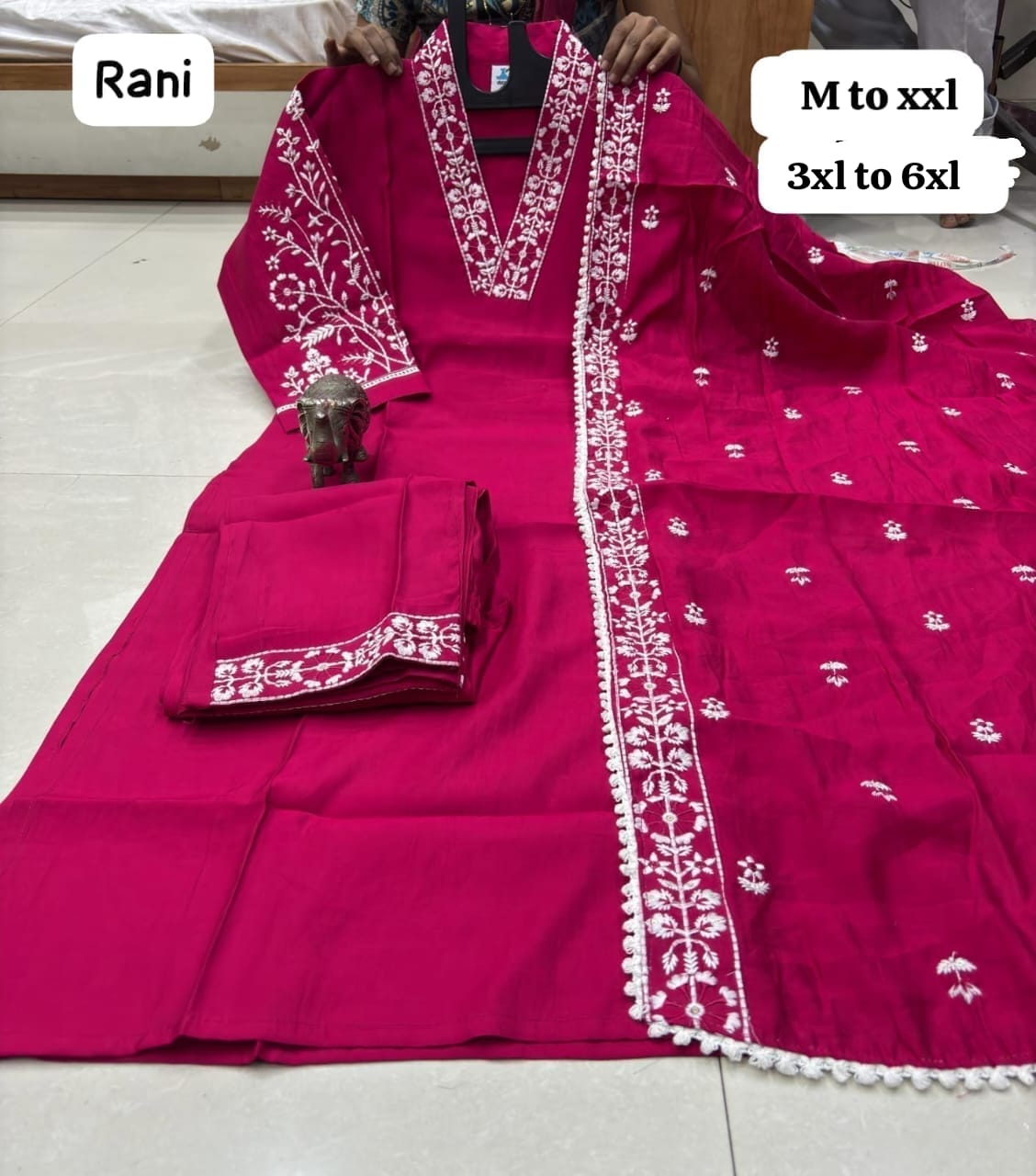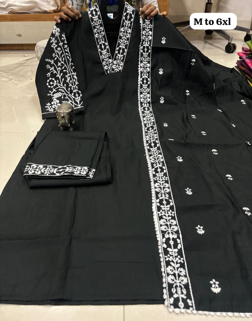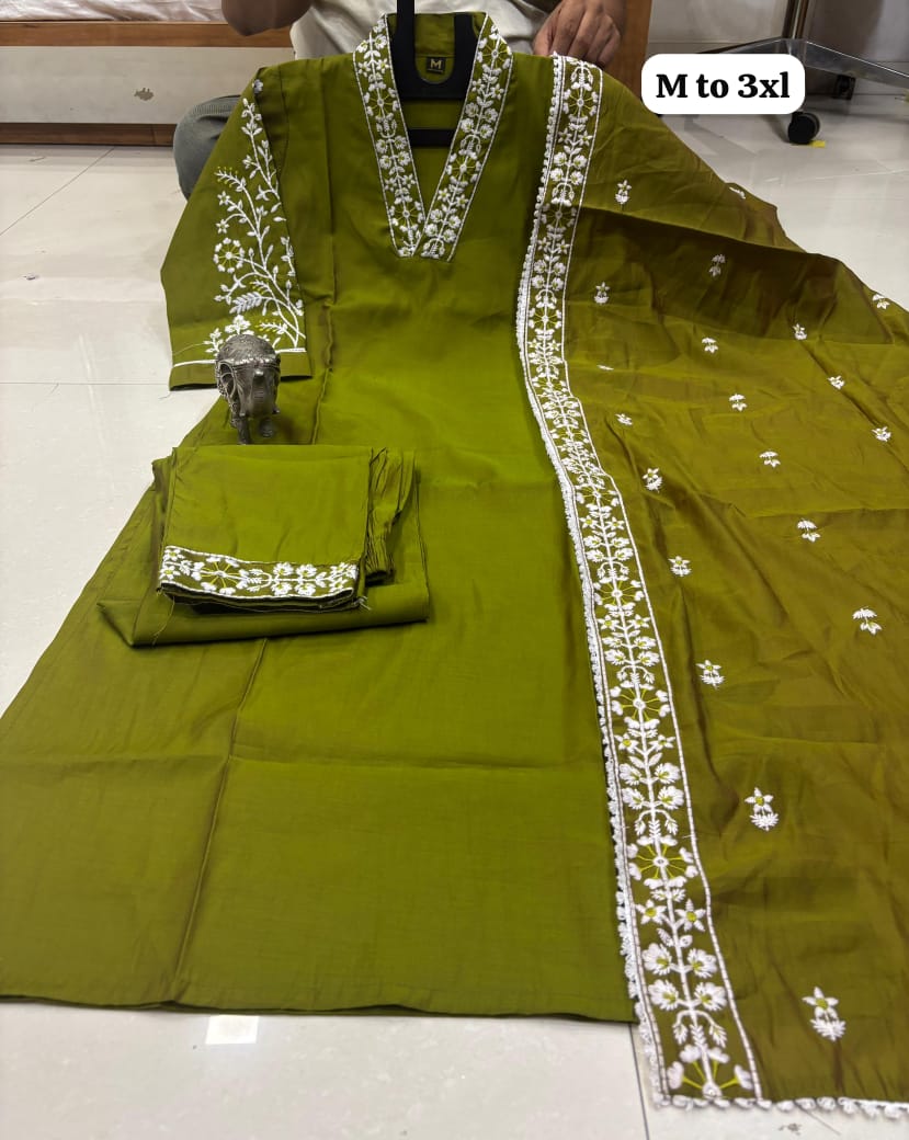 *HEAVY MASLIN LAKHNAVI WORK V NECK KURTI WITH LAKHNAVI WORK DUPATTA PANT SET*😍.